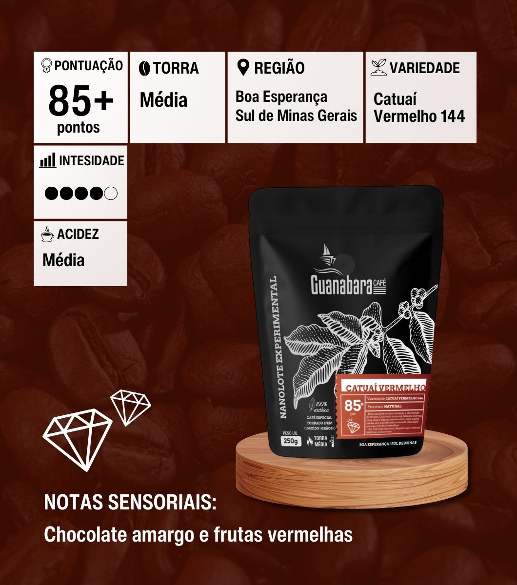 Este é o primeiro café da 2ª edição dos Nanolotes do Campo Experimental da Guanabara Café. Ele traduz inovação e identidade de terroir. Cultivado na nossa fazenda, entrega uma xícara extremamente doce, com acidez média-alta equilibrada e notas de chocolate amargo e frutas vermelhas. Um café experimental, marcante e cheio de propósito, daqueles que contam história a cada xícara.