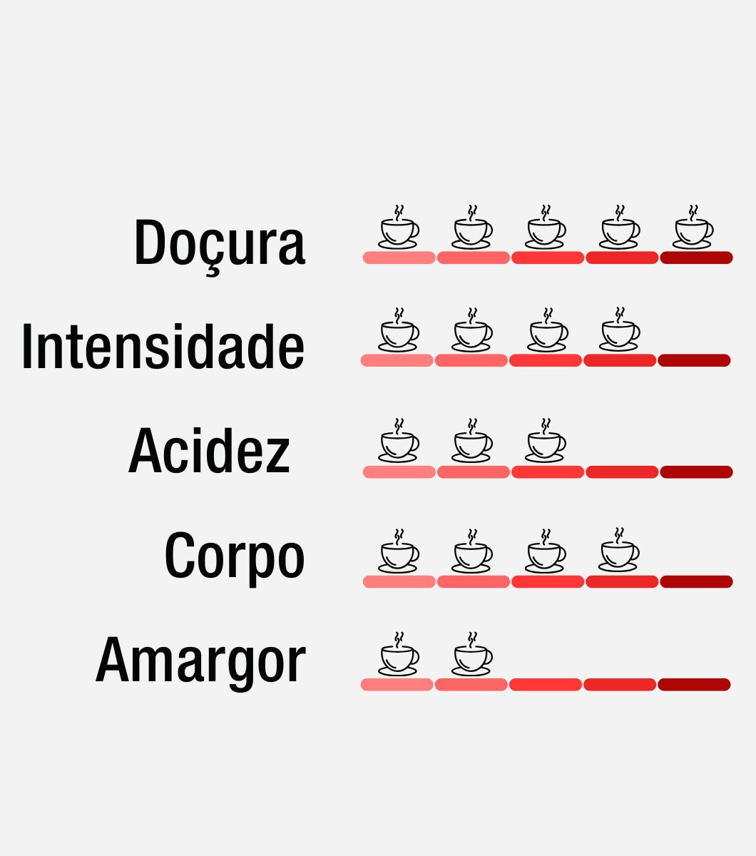 Na xícara, revela-se extremamente doce, com presença marcante e um toque delicado. A acidez média-alta aparece de forma elegante, equilibrando perfeitamente a doçura profunda. As notas sensoriais de chocolate amargo e frutas vermelhas trazem complexidade, profundidade e uma experiência envolvente, que permanece na memória a cada xícara.